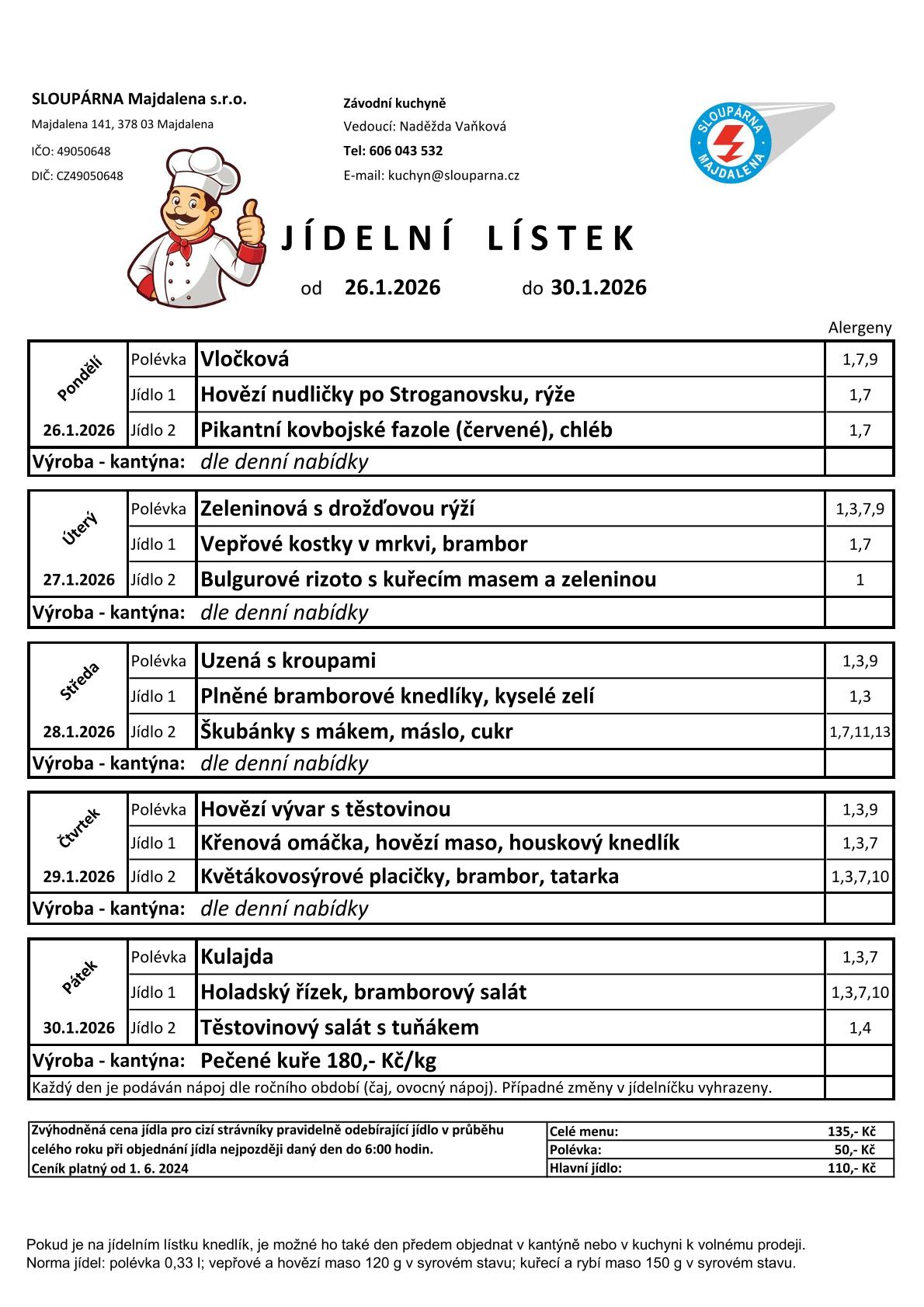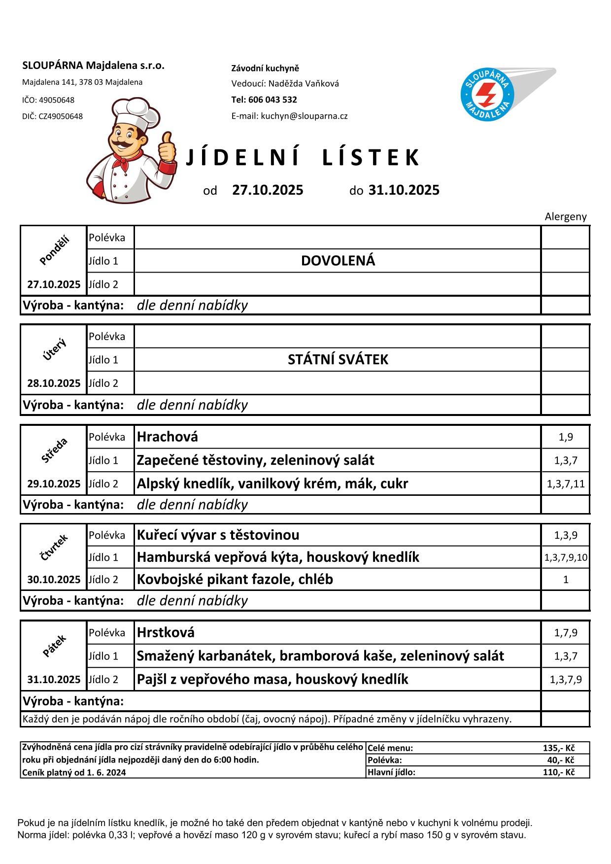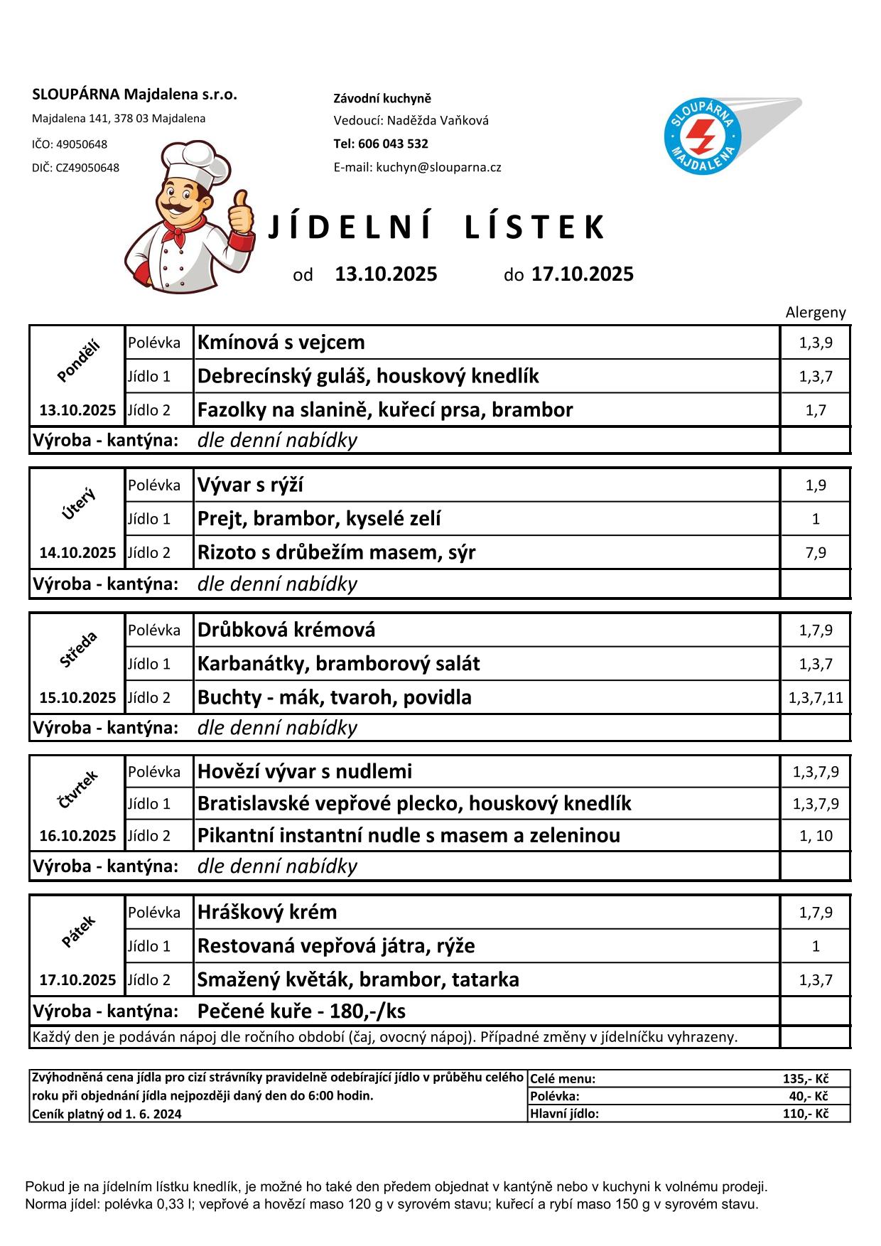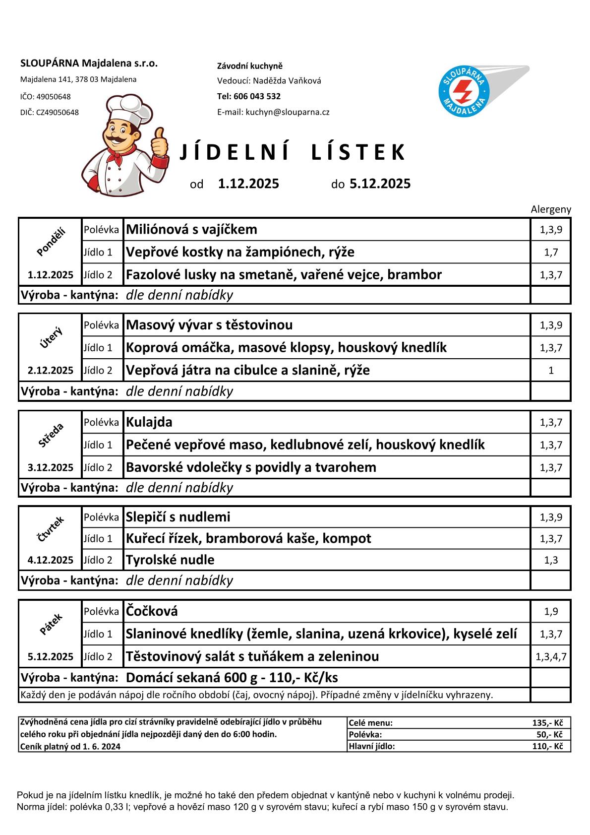 Kontakt pro objednání obědů - 606 043 532 - kuchyn@slouparna.cz
